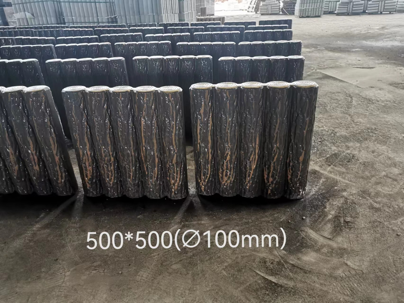采用模具生產(chǎn),水泥沙石通過攪拌機攪拌。在灌入水泥沙石以前,模具先噴油,噴油主要方便后期脫模。隨后再把水泥沙石灌入仿木樹樁石模具中、采用往復式成型機往復生產(chǎn),將鋼筋放置入水泥沙石料中隨后靜置等待脫模。